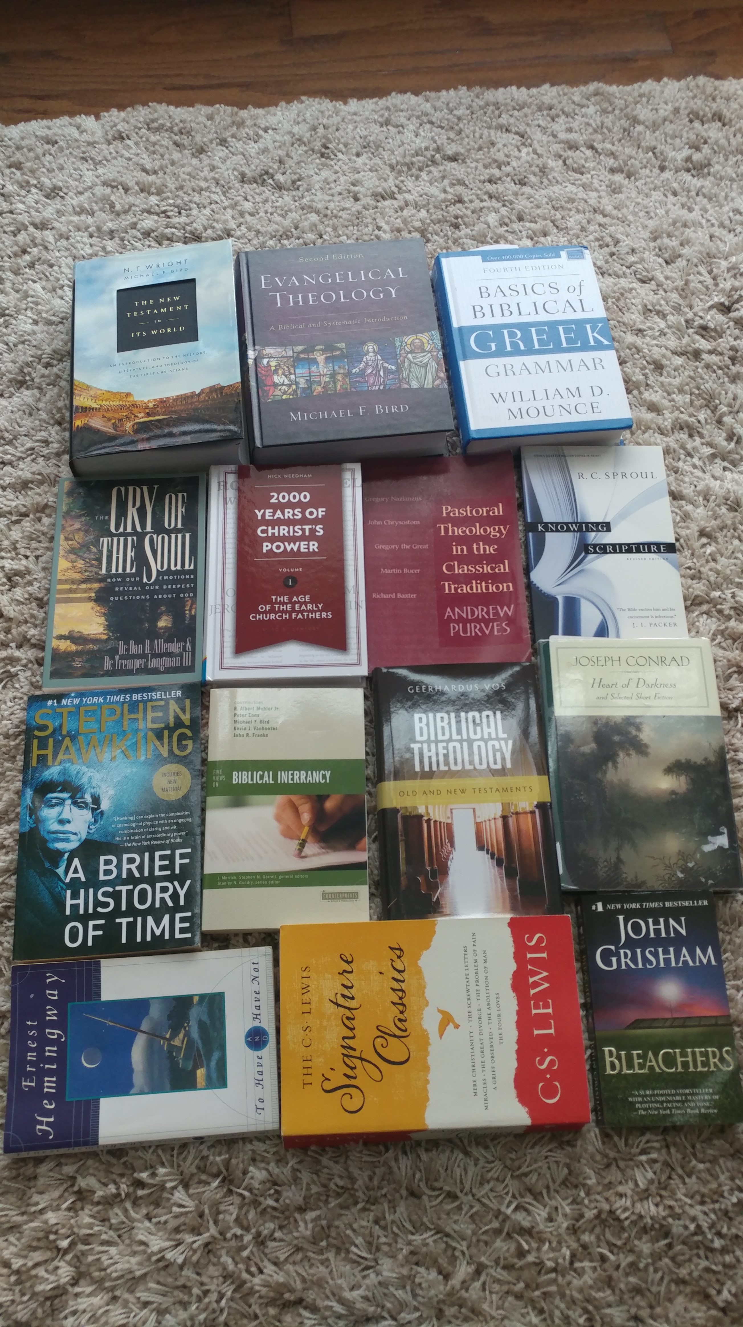 I usually break down by large categories, but I don’t really have that this year. No devotional this year, as we are reading the Bible as a church. I only have one non-fiction, A Brief History of Time, then three fiction books, there CS-Lewis, and the rest Theology/Bible Studies.